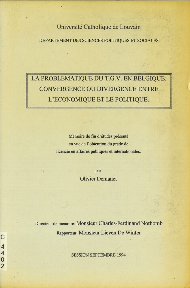 - TitelLa problématique du T.G.V. en Belgique : convergence ou divergence entre l'économique et le politique. Mémoire de fin d'études présenté en vue de l'obtention du grade de licencié en affaires publiques et internationales