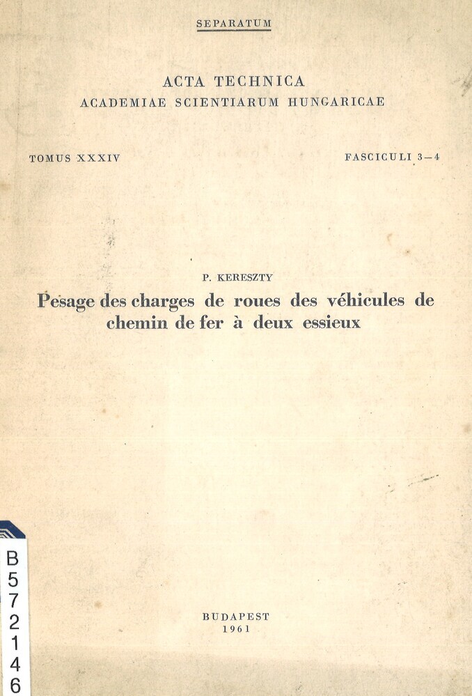- TitelPesage des charges de roues des véhicules de chamin de fer à deux essieux. Acta Technica. Tomus XXXIV. Fasciculi 3-4