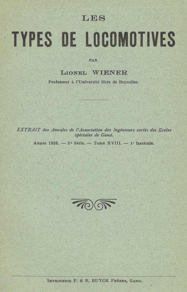 - TitelLes Types de locomotives. Extrait des Annales de l'Association des Ingénieurs sortis des Ecoles spéciales de Gand. Année 1928-5e série-Tome XVIII -1e fasicule