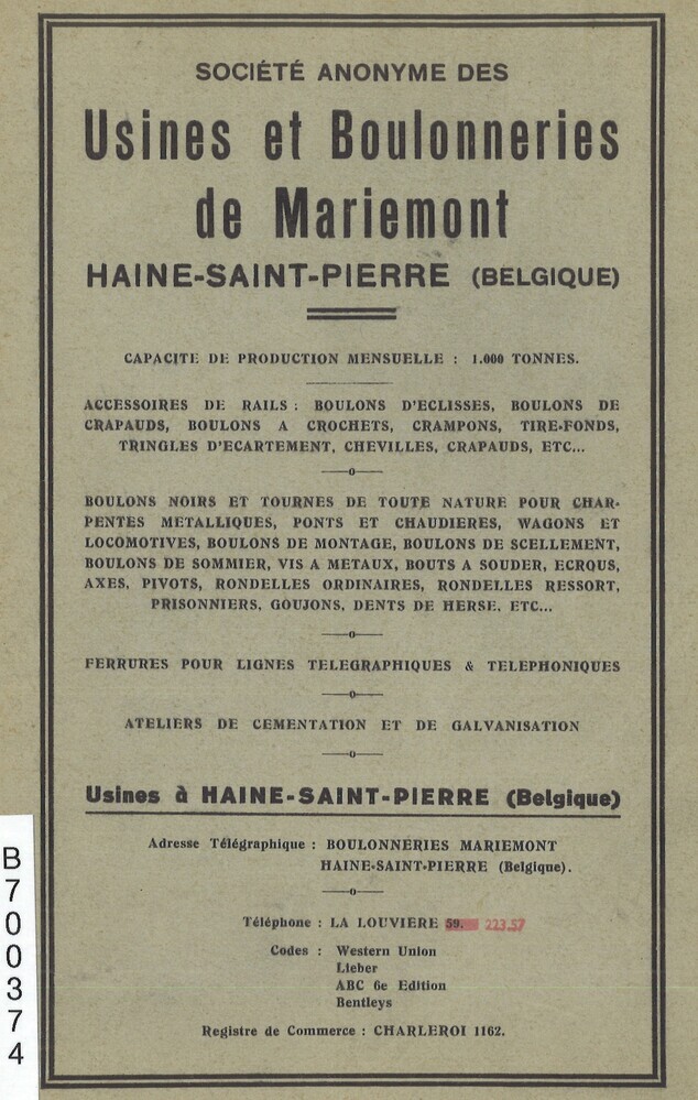 - TitelSociété anonyme des Usines et Boulonneries de Mariemont