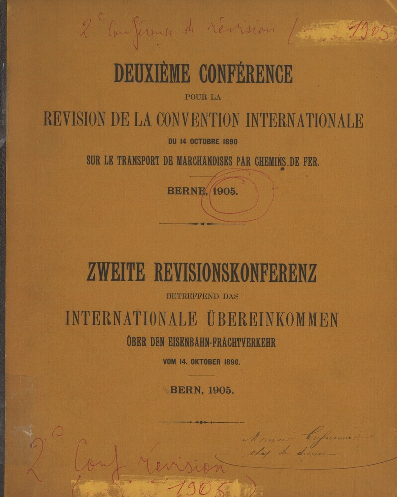 - TitelDeuxième conférence pour la revision de la convention internationale du 14 octobre 1890 sur le transport de marchandises par chemins de fer.; Zweite revisionskonferenz betreffend das Internationale Ubereinkommen über den Eisenbahn-Frachtverkehr vom 14 oktober 1890.