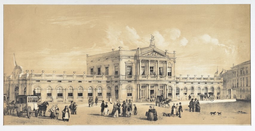 Zicht op de monumentale voorgevel van het station. Op het plein ervoor bevinden zich voetgangers en enkele paardenkoetsen. Links zien we twee omnibussen, wagens voor openbaar vervoer die door twee paarden getrokken worden. Verzameling Instituut voor Financiële Archeologie (Mechelen).