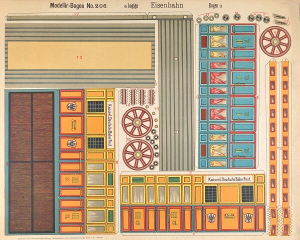 Set van vier vellen papier waar verschillende onderdelen van een trein op worden afgebeeld. Kinderen kunnen deze stukken uitknippen en in elkaar knutselen om een treintje te maken. De set bestaat uit een pakwagen met remhuisje, een open goederenwagen, een gemengd rijtuig eerste en tweede klas, een rijtuig derde klas met postafdeling en een spoorwegbeambte. De locomotief ontbreekt. Verzameling Instituut voor Financiële Archeologie (Mechelen).