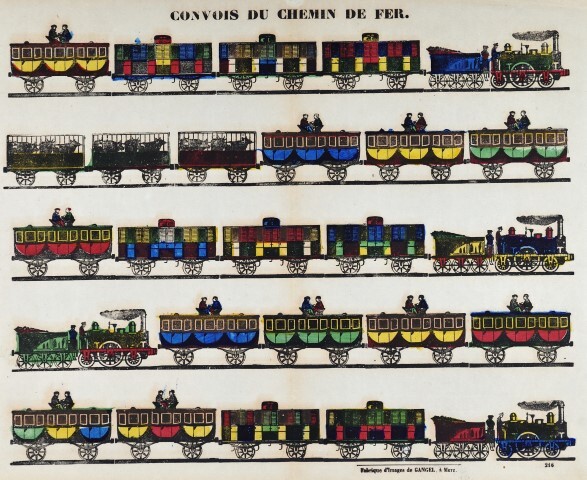 Op deze ingekleurde lithografie worden op vijf rijen voorbeelden van rollend materieel afgebeeld. We zien stoomlocomotieven met tender van het type Single Driver (1A1) die worden bemand door een machinist en stoker, diligence-rijtuigen met op het dak twee remmers, bankwagens en wagens voor dierentransport. Verzameling Instituut voor Financiële Archeologie (Mechelen).