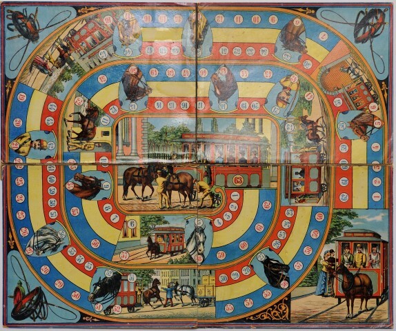 Dit spel is een variatie op ganzenbord. Het bord telt 63 vakjes plus 22 extra vakjes. In de vier hoeken werden garelen en een koets op tramsporen voortgetrokken door een paard afgebeeld. Op de vakjes zien we afbeeldingen van paarden en tramkoetsen. Dit spel diende om de buurtspoorwegen te promoten. Verzameling Instituut voor Financiële Archeologie (Mechelen).