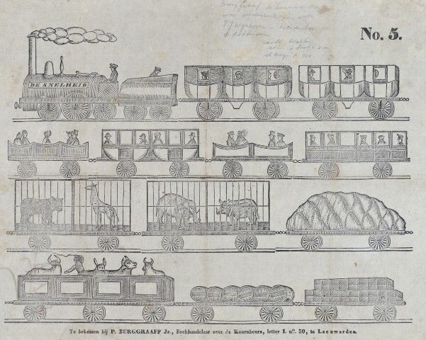 De trein wordt op vier lijnen afgebeeld. Hij bestaat uit stoomlocomotief met tender 'De snelheid', twee diligencerijtuigen, twee gesloten rijtuigen, twee open rijtuigen, twee kooien voor dierentransport met een beer, giraf, olifant en neushoorn in, een platte wagen met een hoop goederen, een open wagen met ossen, een platte wagen met vaten en een platte wagen met dozen. Verzameling Instituut voor Financiële Archeologie (Mechelen).