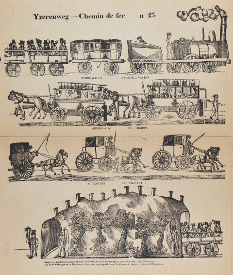 Deze lithografie wordt verdeeld over vier lijnen. Op de eerste lijn zien we een stoomlocomotief type Single Driver (1A1) met tender die een diligencerijtuig en open rijtuigen sleept. Onder deze tekening staat het opschrift 'stoomwagen machine à vapeur'. Op de tweede lijn met opschrift 'omnibussen des omnibus' staan twee omnibussen, dit waren paardenkoetsen voor openbaar vervoer. De derde lijn toont een sjees en twee kleine koetsen met een tweespan. Daaronder het opschrift 'vigilanten des vigilantes'. De onderste lijn is getiteld 'Gezigt van den Berg tusschen Thienen en Loven waar de Stoomwagen onder door rijdt, lang 20 minuten. Vue de la Montagne entre Tirlemont et Louvain, sous laquelle passe la Machine à vapeur, distance de 20 minutes.' Deze tekening is een voorstelling van de tunnel van Kumtich met bovenaan schoorstenen om de stoom van de locomotieven in de tunnel af te voeren. Aan de in- en uitgang van de tunnel staan wachters. We zien nog net een open bankwagen in de tunnel verdwijnen. Verzameling Instituut voor Financiële Archeologie (Mechelen).