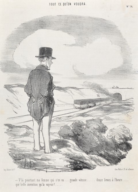 Deze humoristische prent werd uit een krant geknipt. We zien een man met hoed die een wegrijdende trein nakijkt. De trein rijdt een tunnel in. Onder de tekening staat het opschrift 'V'là pourtant ma femme qui s'en va…grande vitesse…douze lieues à l'heure…qué belle invention qu'la vapeur!' Verzameling Instituut voor Financiële Archeologie (Mechelen).