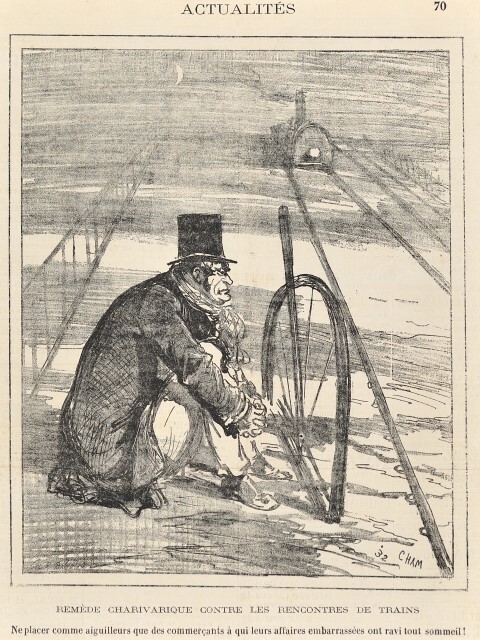 Deze spotprent werd uit een krant geknipt. We zien een netjes geklede man voor een wisselhendel zitten, nors voor zich uit starend. In de verte komt een stoomtrein aan. Onder de titel bevindt zich het opschrift 'Ne placer comme aiguilleurs que des commerçants à qui leurs affaires embarrassées ont ravi tout sommeil!' Verzameling Instituut voor Financiële Archeologie (Mechelen).