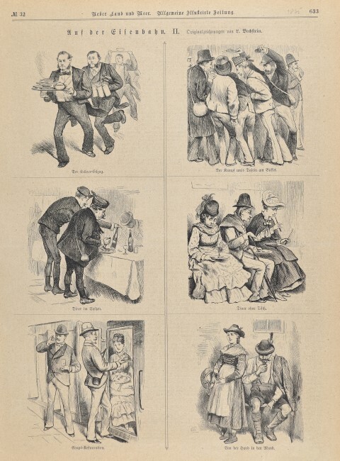 Deze zes kleine spotprenten komen uit het tijdschrift "Ueber Land und Meer. Allgemeine Illustrierte Zeitung". Ze verbeelden op humoristische wijze problemen die treinreizigers tegenkomen in restauratierijtuigen of in het algemeen met betrekking tot eten in de trein. Verzameling Instituut voor Financiële Archeologie (Mechelen).