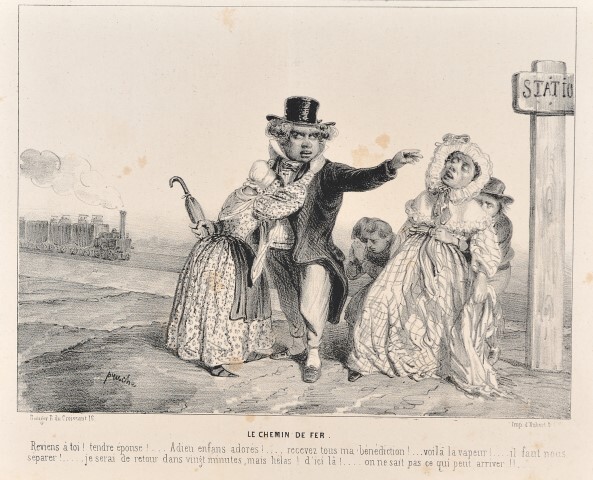 Humoristische prent. We zien een gezin dat wacht op de trein. Rechts bevindt zich een bord met het opschrift 'station'. Op het achterplan komt de trein aan. De moeder valt flauw en de kinderen huilen. De vader neemt op overdreven heroïsche wijze afscheid. Onder de litho staat de tekst 'Reviens à toi! Tendre épouse!...Adieu enfans adorés!...recevez tous ma bénédiction! voilà la vapeur!...il faut nous séparer!...je serai de retour dans vingt minutes, mais hélas! d'ici là!...on ne sait pas ce qui peut arriver!!' Verzameling Instituut voor Financiële Archeologie (Mechelen).