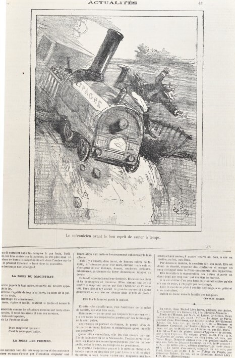 Deze spotprent komt uit de krant. De ontspoorde stoomtrein 'Espagne' stort een afgrond in. De machinist springt net op tijd uit de trein. Boven de prent bevindt zich het opschrift 'Actualités'. Rechts onderaan de tekening staat 'Cham 22'. Verzameling Instituut voor Financiële Archeologie (Mechelen).