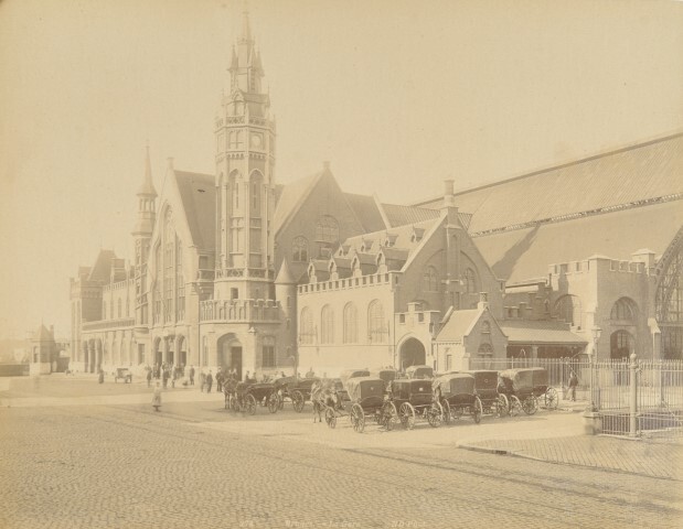 Deze foto toont de voor- en zijgevel van het neogotische station met uurwerktoren en perronoverkapping. Voor het gebouw staan paardenkoetsen. Een afsluiting in gietijzer bakent het spoorwegdomein af. Verzameling Instituut voor Financiële Archeologie (Mechelen).