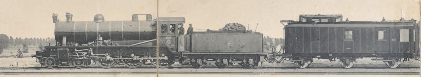 Deze stoomlocomotief type 19 (2C Ten Wheel) sleept verschillende rijtuigen en pakwagens: pakwagen 15901, twee rijtuigen tweede klas 16504, een gereserveerd rijtuig 16002, twee rijtuigen derde klas 17304 en pakwagen 15902. Boven en onder de foto staan de opschriften 'Société anonyme de travaux Dyle & Bacalan Train Bloc Bruxelles Anvers' en 'Siège Social: Paris 15, Avenue Matignon Ateliers de la Dyle Louvain (Belgique)'. Een bloktrein is samengesteld uit een vaste reeks rijtuigen op draaistellen met hoog comfort. Verzameling Instituut voor Financiële Archeologie (Mechelen).