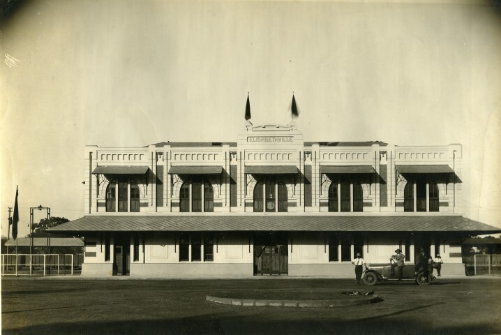 Fotoafdruk van de voorzijde van het station Elisabethville (het huidige Lubumbashi) in het voormalig Belgisch Congo. We zien achter het station op het spoor nog net een paar goederenwagens. Op het stationsplein poseren enkele reizigers aan een auto. Verzameling Instituut voor Financiële Archeologie (Mechelen).