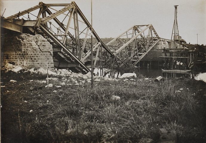 Zicht op een vernielde spoorwegbrug over de Malagarasirivier in voormalig Duits Oost-Afrika (Tanzania) onder Belgische bezetting. Om de opmars van de ‘Force Publique du Congo Belge’ in september 1916 naar Tabora te vertragen, bliezen Duitse genietroepen de brug op. Verzameling Instituut voor Financiële Archeologie (Mechelen).