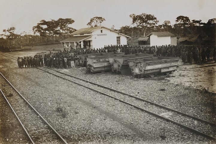 Zicht op het stationsgebouw van Kazuramimba in voormalig Duits Oost-Afrika (Tanzania) onder Belgische bezetting. Achter het gebouw zien we enkele hutjes. Voor het stationsgebouw poseren vermoedelijk arbeiders en soldaten van 'La Force Publique du Congo Belge'. Naast de spoorlijnen staan enkele tremelwagens. Verzameling Instituut voor Financiële Archeologie (Mechelen).