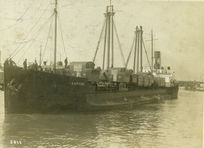 Op het dek staan tenderlocomotieven en gesloten goederenwagens. Een opvarende poseert bovenop een locomotief. Op het schip zien we ook nog andere bemanningsleden. Verzameling Instituut voor Financiële Archeologie (Mechelen).