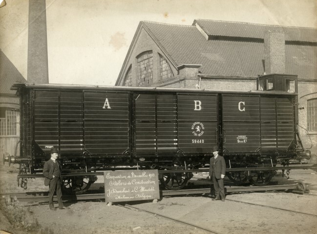 Twee mannen poseren voor deze gesloten goederenwagen. Op de wagen staan de letters A B C, het logo van de Belgische Staatsspoorwegen en het wagennummer. Voor de wagen staat een bord met het opschrift 'Exposition de Bruxelles 1910 Ateliers de Construction J. Droeshout et C. Windels. Malines Belgique'. Op de achtergrond zien we een loods. Verzameling Instituut voor Financiële Archeologie (Mechelen).