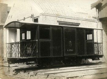 BeschrijvingDeze fotoafdruk toont het zijaanzicht van een bagagepakwagen van de NMVB met twee balkons. De wagen staat voor een loods in de Raghenofabriek.