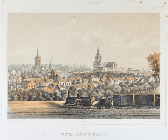 Lithografie met gele kleuraccenten. Op de voorgrond zien we een stoomlocomotief type 'Single Driver' (1A1) met tender en goederenwagens voorbijrijden. Daarachter een panoramisch zicht op de stad Tienen met de Onze-Lieve-Vrouw-ten-Poelkerk en de Sint-Germanuskerk. Verzameling Instituut voor Financiële Archeologie (Mechelen).