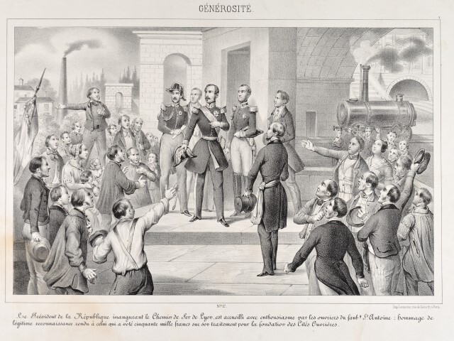 Inwijding van de 'Chemin de fer de Lyon' in Frankrijk. Rond de president verzamelen zich de toeschouwers. Achter hen zien we het oorspronkelijke stationsgebouw met overkapping en de spoorlijn waar een stoomlocomotief klaarstaat. Onder de prent bevindt zich de tekst: 'Le Président de la République inaugurant le Chemin de Fer de Lyon, est accuelli avec enthousiasme par les ouvriers du faub St Antoine: hommage de légitime reconnaissance rendu à celui qui a voté cinquante mille francs sur son traitement pour la fondation des Cités Ouvrières.' Verzameling Instituut voor Financiële Archeologie (Mechelen).