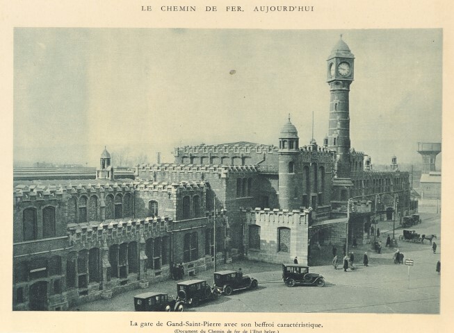 Zwart-witfoto van station Gent-Sint-Pieters uit een publicatie. Op het stationsplein staan mensen, enkele auto's en ook nog een paardenkoets. Op de achtergrond zien we een watertoren. Onder de foto bevindt zich het opschrift "La gare de Gand-Saint-Pierre avec son beffroi caractéristique. (document de Chemin de fer de l'Etat belge.)" Verzameling Instituut voor Financiële Archeologie (Mechelen).