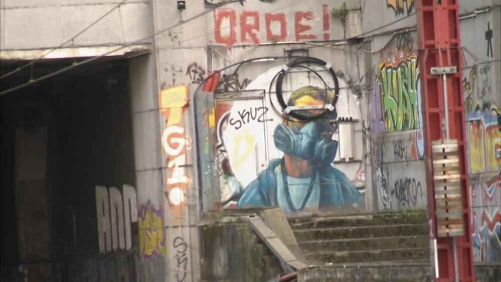 BeschrijvingClose-up van de graffiti op de wanden aan de ingang van de tunnel van de Noord-Zuidverbinding, nabij station Brussel-Kapellekerk.