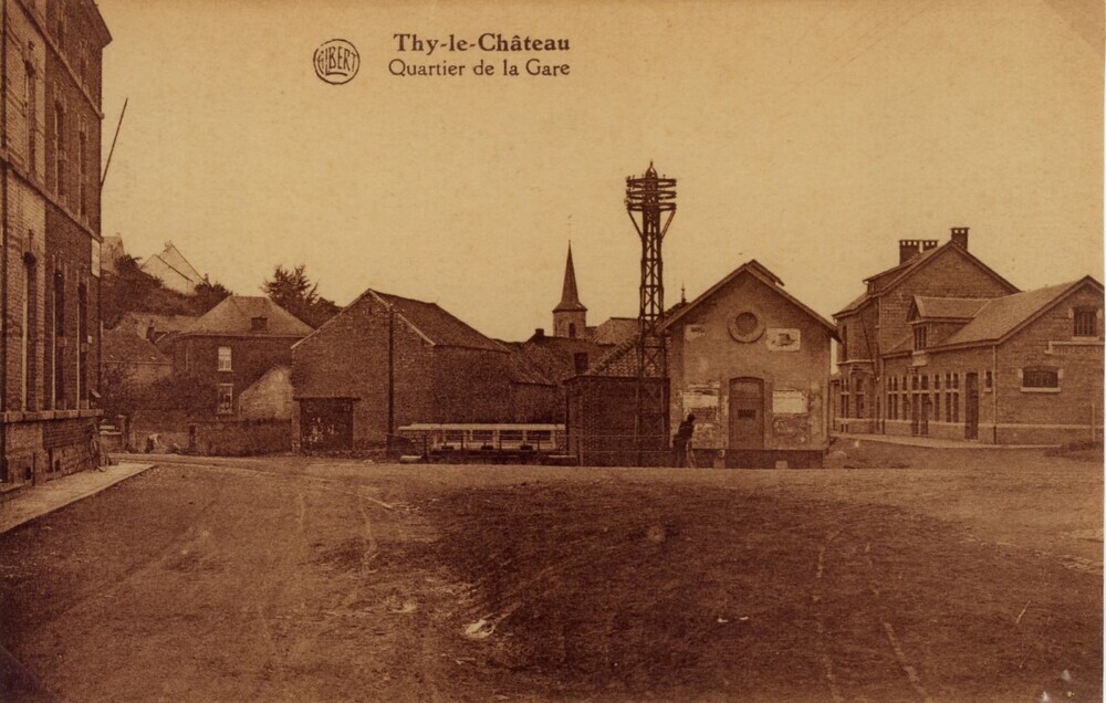 Reproductie van een postkaart met als opschriften ‘Thy-le-Château Quartier de la Gare’ en het merk van uitgever ‘Albert’. De kaart toont een dorpsplein met rechts in de achtergrond het tweede stationsgebouw onder een zadeldak met dakvensters. Op het dorpsplein staat een telefoon- en telegraafmast in vakwerk. Het voormalige station Thy-le-Château lag langs spoorlijn 111 (Thuillies – Laneffe). Het station werd geopend in 1848 door de Société du chemin de fer de l'Entre-Sambre-et-Meuse. In 1924 werd een nieuw stationsgebouw opgetrokken, dat we op de deze kaart zien. Het station werd gesloten voor reizigers in 1960. Er vond nog goederentransport plaats tot 1988, wanneer spoorlijn 111 definitief gesloten werd.