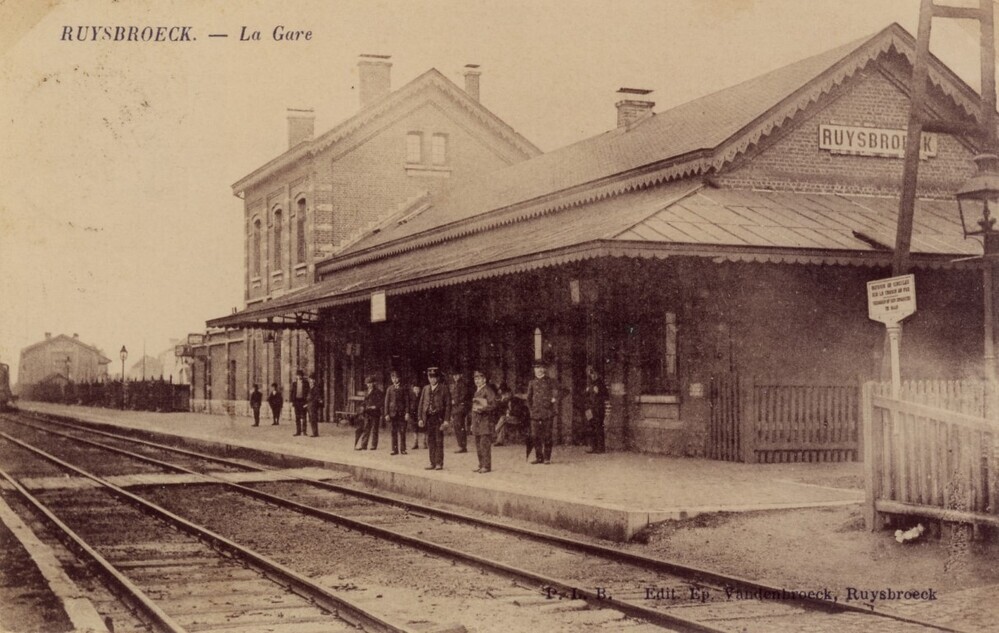 Reproductie van een postkaart met als opschriften 'Ruysbroeck - La Gare' en 'P.I.B. Edit. Ep. Vandenbroeck, Ruysbroeck'. We zien de achtergevel van het stationsgebouw uit 1888. Het bestaat uit een centraal deel met twee bouwlagen onder een zadeldak en twee lage vleugels. De naam staat op de zijgevel. Onder de luifel van het eerste perron poseren stationspersoneel en reizigers. Het station ligt langs lijn 96 (Brussel-Zuid – Bergen).