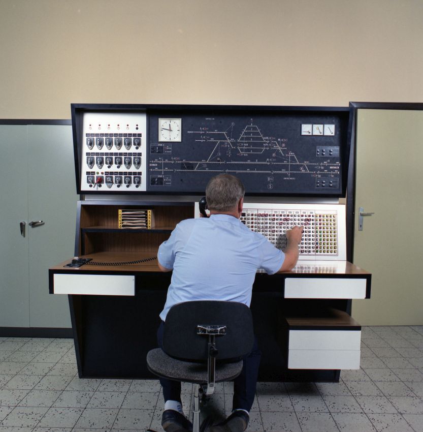 BeschrijvingDeze fotogroep bestaat uit twee negatieven. De foto's tonen het interieur van de seinpost alrelais met seintafel, drukknoppen, klok en optisch bord. Een seingever drukt tijdens het telefoneren een bedieningstoets in.