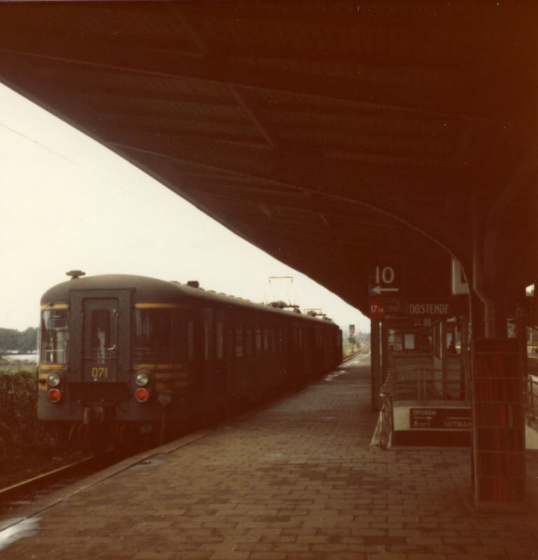 Motorstel 071(reeks 00 schijf 1954) staat op het spoor 10. Het betreft de omnibus naar Oostende. Het treinstel is groen geschilderd met gele zichtbaarheidsstrepen. Het perron is met een luifel, een spoornummer, een manuele treinaankondiger en een toegangstrap naar de onderdoorgang uitgerust. Schenking van Hugo De Bot.