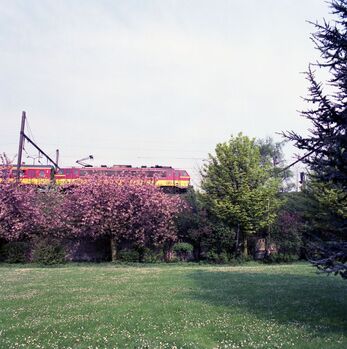 BeschrijvingDe foto toont een locomotief reeks 11 met een Beneluxtrein aan de haak. Locomotief en rijtuig zijn bordeaux en geel geschilderd.