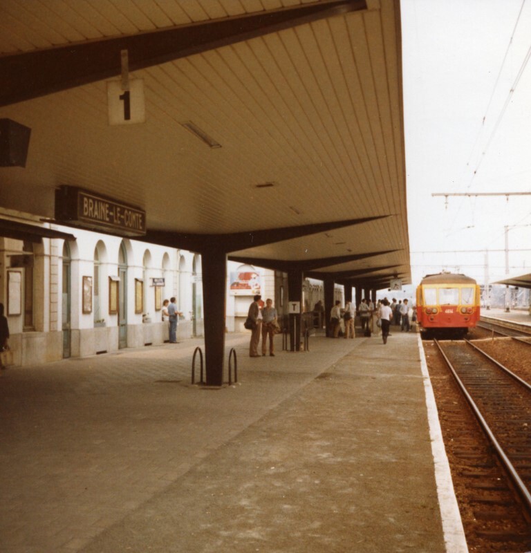 Op het spoor 1 van het station 's-Gravenbrakel zien we de motorwagen 4614 in de rood/gele livrei. Er staan reizigers klaar om in te stappen. Het perron is overdekt met een luifel, waaraan een stationsnaambord en het perronnummer bevestigd zijn. Schenking van Hugo De Bot.