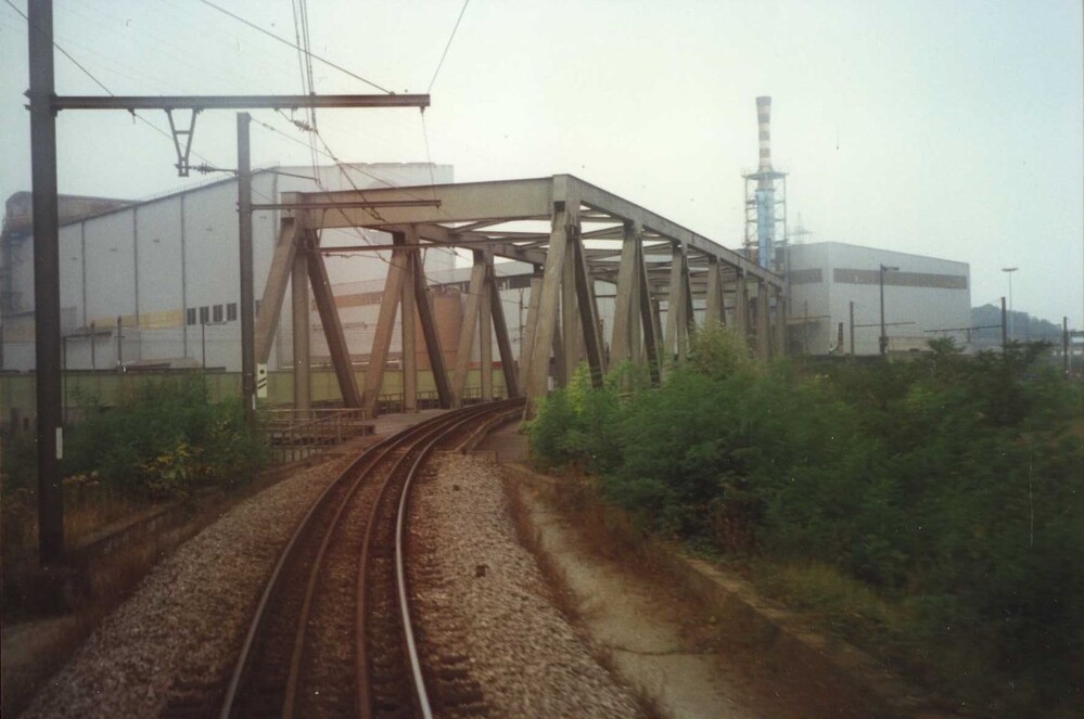 De foto toont de vakwerkbrug over de Samber met het geëlektrificeerde enkelspoor. Een dubbele contrarail moet de gevolgen van een mogelijke ontsporing beperken. Voor het kunstwerk zien we links een afstandsbaken dat een stopsein voorafgaat.