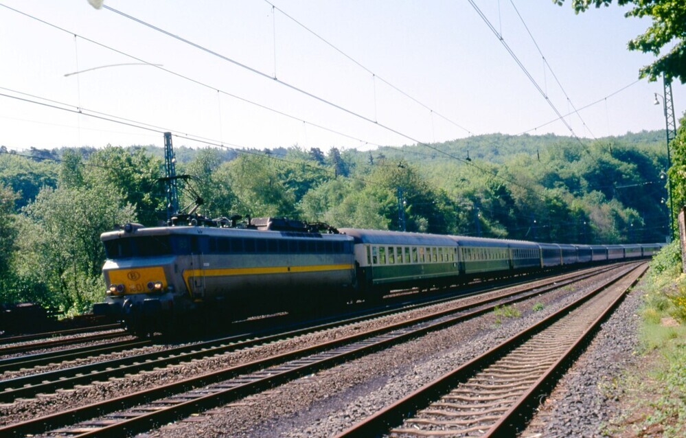 Deze fotogroep bevat twee dia's. We zien een internationale trein gesleept door elektrische locomotief 1801 (reeks 18). De trein is samengesteld uit Duitse en Franse rijtuigen.