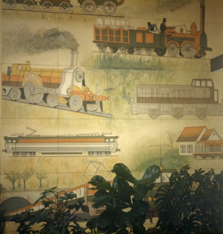 De foto toont de muurschildering van het handelsagentschap in het station Brugge. De schildering toont verschillende spoorvoertuigen uit binnen- en buitenland door de jaren heen.