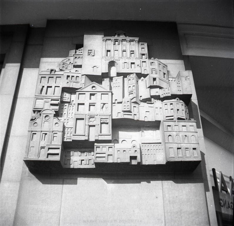 De foto toont een reliëf dat zich aan de rechterzijde van de hoofdingang bevindt. Dit reliëf geeft de Brusselse wijk De Putterij weer die afgebroken werd voor de aanleg van de Noord-Zuidverbinding en heel specifiek voor de bouw van Brussel-Centraal. Schenking van Hugo De Bot.