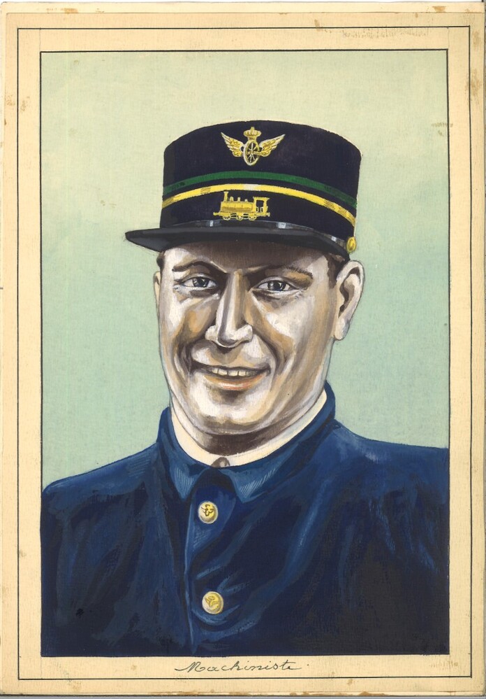 De treinbestuurder op dit portret draagt een donkerblauw uniform met gouden knopen. Hij draagt ook een donkerblauwe kepie met een groene en een gouden band, een stoomlocomotief en een gevleugeld wiel. Onder het portret staat 'machiniste' geschreven. Schenking van dhr. Lebbe.