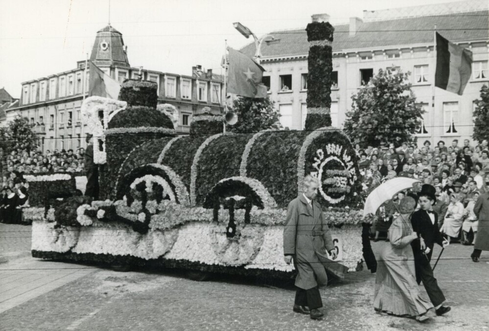 La photo montre un char de parade représentant la locomotive à vapeur Pays de Waes. Ce char participait à un cortège organisé à Saint-Nicolas en août 1955. Le carrosse est constitué d'un cadre recouvert d'un revêtement en carton sur lequel sont fixées des fleurs. La réplique porte l'inscription « Land van Waas ». Un homme et une femme en costumes traditionnels précèdent le char sur lequel est posée la locomotive. Don de M. Sion.
