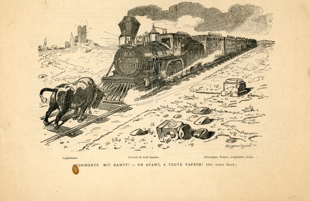 Krantenknipsel van een gravure. De spotprent toont een stoomtrein met op de deur van de rookkast het opschrift 'Acht stunden arbeit'. Voor de trein staat een stier met de hoorns vooruitgestoken. Op zijn rug staat 'Kapitalismus'. Het landschap rondom dit tafereel is dor en verlaten, met in de achtergrond de ruïnes van een dorp. De tekening symboliseert de strijd die de arbeiders leverden voor de achturige werkdag.
