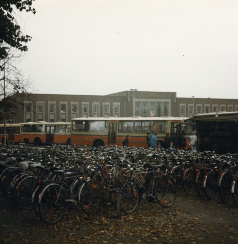 BeschrijvingDe foto toont de fietsenstalling op het plein voor het station. Achter de fietsen zien we enkele autobussen van NMVB en in de achtergrond de voorgevel van het station.