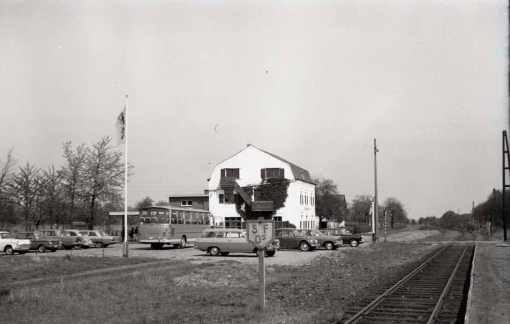 Op de foto zien we een spoor met een seinbord. De initialen 'S' en 'F' staan voor 'siffler' en 'fluiten'. Het geeft aan dat de machinist aan 5 km/u het eerstvolgende obstakel (zoals een overweg) fluitend moet overschrijden. Op de achtergrond is er een huis met daarvoor enkele geparkeerde auto's en een autocar. Schenking van Hugo De Bot.