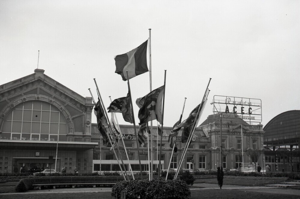 De foto toont het station langs de straatzijde. Op het plein voor het station staan enkele wapperende vlaggen, waaronder de Belgische driekleur. Rechts op het dak van één van de gebouwen staat reclame voor ACEC.