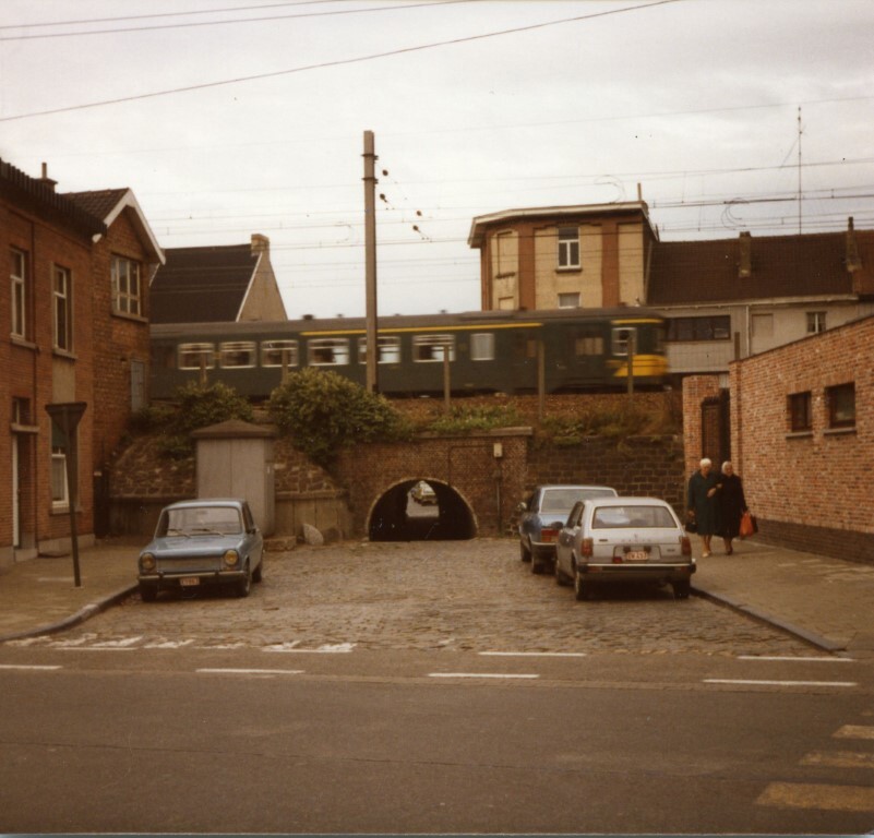 Op de foto zien we de onderdoorgang voor voetgangers gezien vanaf de Hundelgemsesteenweg richting Moriaanstraat. Voor de tunnel staan enkele geparkeerde auto's. Een reizigerstrein rijdt net voorbij boven de voetgangerstunnel. Het treinstel is groen geschilderd met gele zichtbaarheidsstrepen. Schenking van Hugo De Bot.