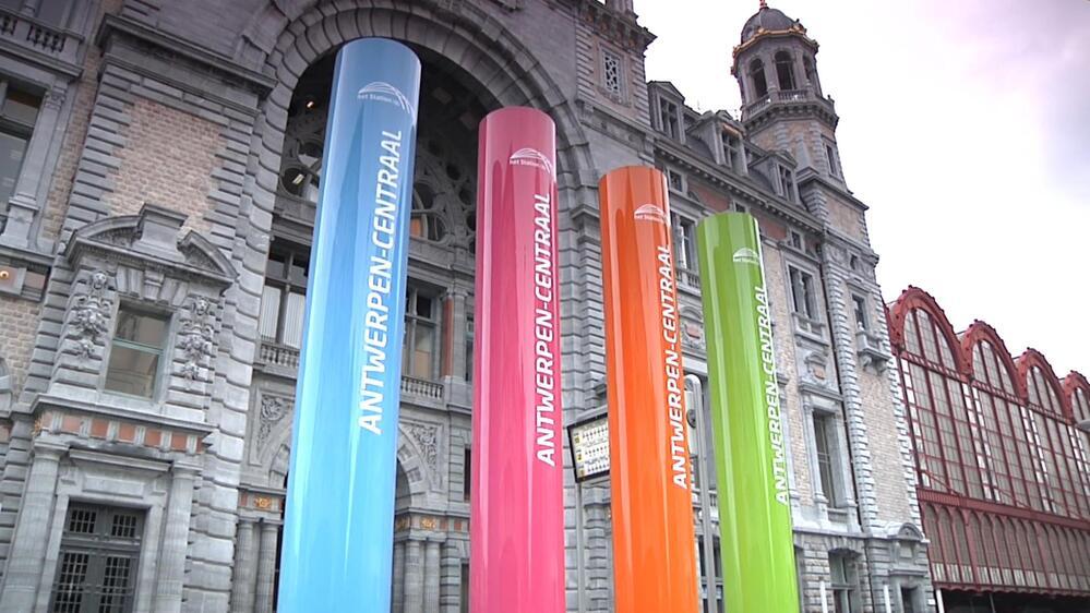 BeschrijvingZicht op de zijgevel van station Antwerpen-Centraal met de vier gekleurde zuilen met daarop vermeld 'Antwerpen-Centraal'.