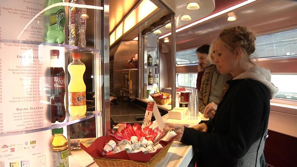 BeschrijvingIn het barrijtuig van Thalys bestellen reizigers iets aan de bar.