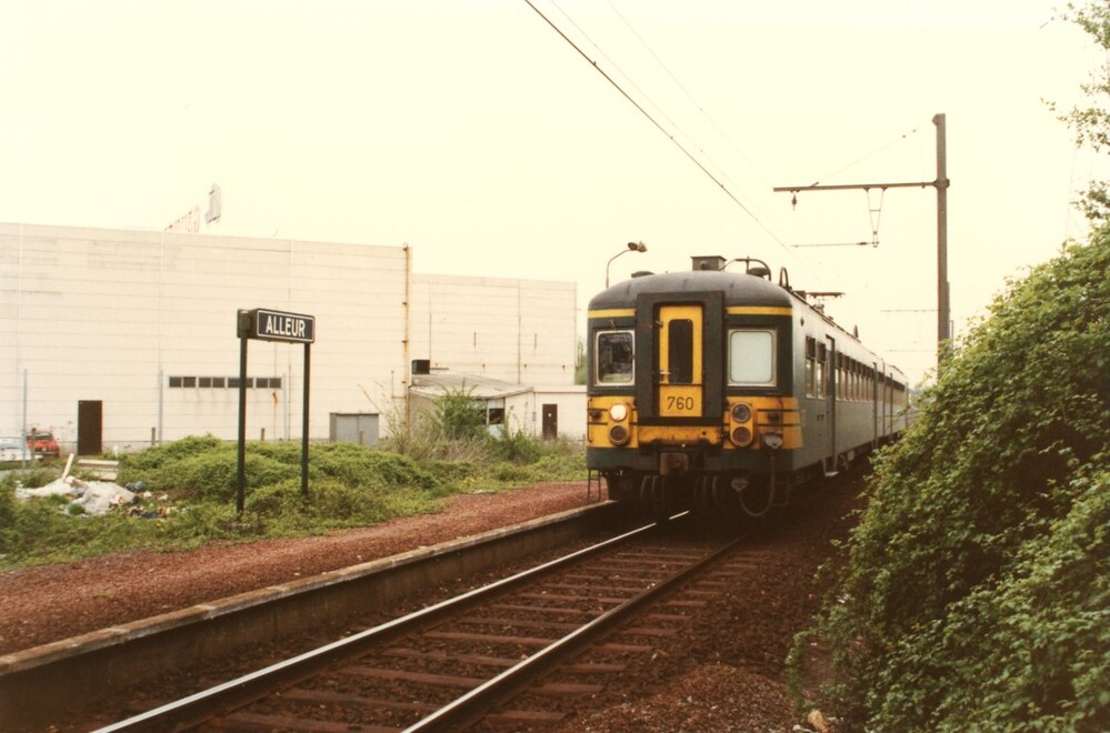 Dit motorstel behoort tot de reeks 06 schijf 1979. Het bevindt zich aan het perron in station Alleur. Links zien we een stationsnaambord op het perron. Het motorstel bevindt zich op de ondertussen afgeschafte spoorlijn 31 (Liers – Ans). Schenking van Marc Hautefin.