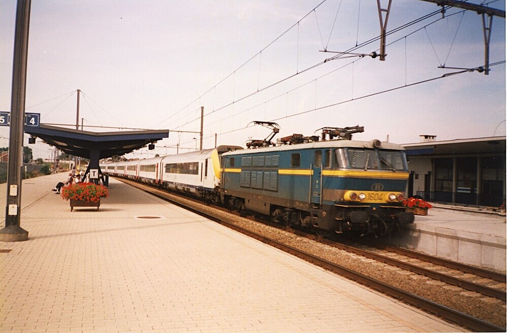 Deze locomotief behoort tot de reeks 16 en heeft I 11-rijtuigen aan de haak. De trein rijdt het station voorbij richting Luik-Guillemins. Achter de locomotief zien we een rijtuig met stuurpost. Vermoedelijk is dit een trein van Oostende naar Keulen. Op het bebloemde perron zien we de typische luifels. Schenking van Marc Hautefin.