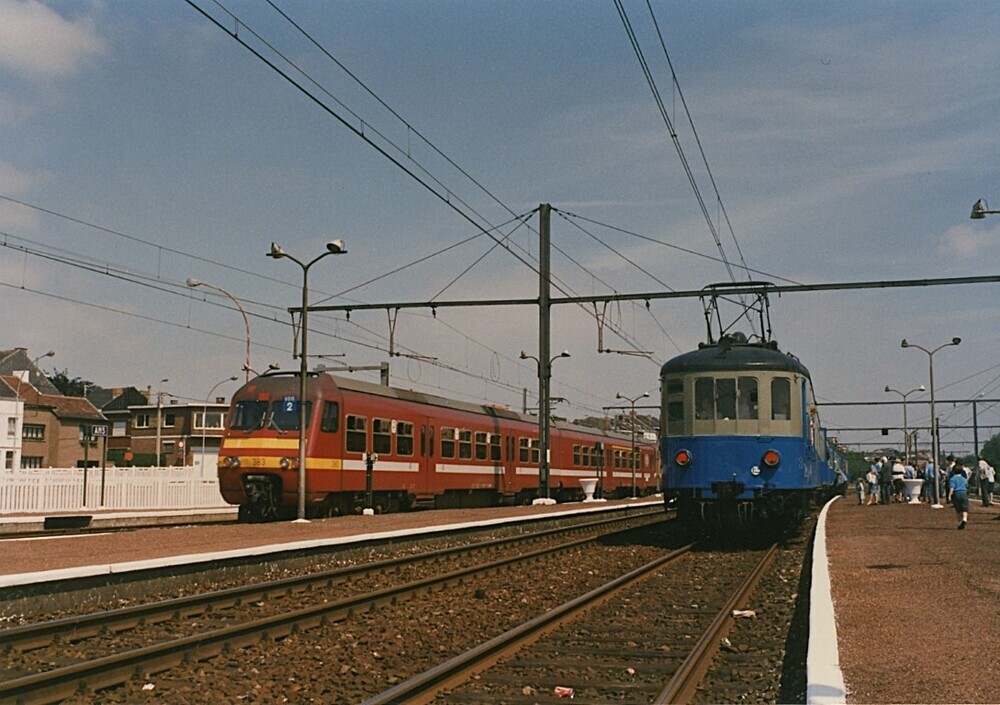 Motorstel 383 behoort tot de reeks 03, schijf 1983. Het historische motorstel 12 (type 1935) voert hier een speciale toeristische rit uit. De perronboorden, de betonnen afsluiting en de grote ronde bloempotten zijn vermoedelijk pas witgekalkt. Schenking van Marc Hautefin.